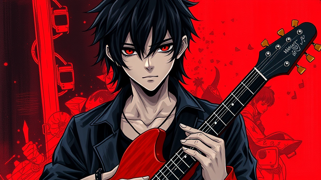 A captivating portrait of a stoic anime boy drawn in the style of a Davinci sketch, holding a sleek electric guitar with a nod to rock music. His edgy persona is accentuated by sharp spikes and a punk-inspired wristband. His dark black hair falls effortlessly, complementing his cool and enigmatic aura. The background features a dramatic play of neon red and deep black tones, enhancing the mysterious and alluring focus of the image. The scene captures the essence of a rebellious spirit with a touch of artistic intrigue.