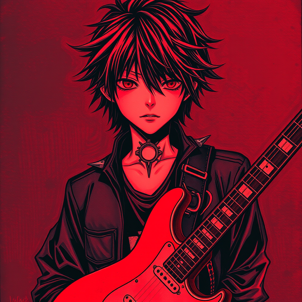 A captivating portrait of a stoic anime boy, etched in a Drypoint style, holding a sleek electric guitar. He exudes a cool attitude with edgy spikes in his attire, a punk-inspired wristband, and dark, flowing black hair. His presence is enhanced through a mysterious focus with a hint of rock music influence, reminiscent of the Davinci drawing style. The portrait is bathed in neon red and deep black tones, adding an energetic yet moody atmosphere to his enigmatic persona. The setting, with an aspect ratio of 9:16, further emphasizes his intriguing and dynamic aura.