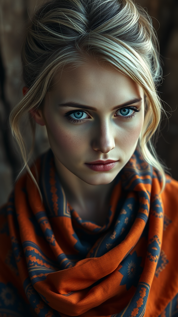A captivating portrait of a striking Siberian woman lost in deep thought, her piercing blue eyes reflecting a world of stories. Her fair skin gently glows with a warm simplicity, with a hairstyle of a messy bun interwoven with soft blonde highlights. She is adorned in an exquisite ensemble of vibrant orange and blue batik, richly layered and draped gracefully across her shoulders, paying homage to her cultural roots. The subtle interplay of light casts a soft halo around her, blending seamlessly with the rustic, timeworn backdrop, enhancing the depth of her introspective gaze, as if she holds the secrets of her lineage within.