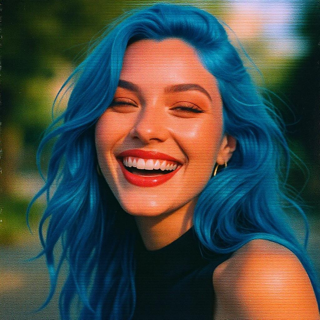 A captivating portrait of a striking woman with vibrant blue hair, her radiant smile capturing the essence of spontaneous joy, styled in the manner of animated gifs, with fleeting moments of candid charm, intricate details that reveal themselves upon closer look, captured on Provia film, drawing influence from Inessa Garmash and Natalia Rak, enhanced with rich, vivid colors, maintaining a raw, authentic style, in an elongated vertical aspect ratio.