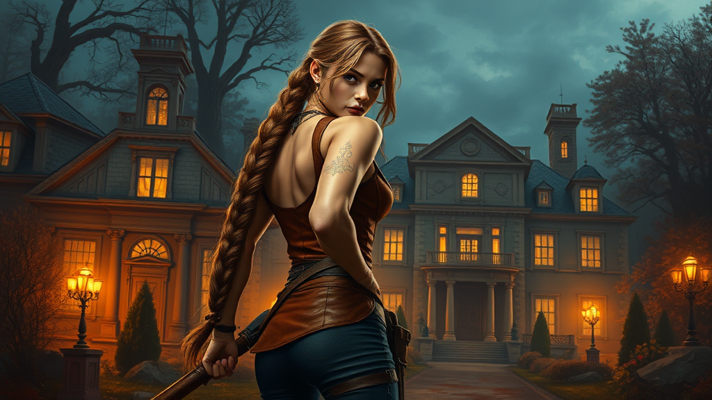A captivating portrait of a strong and confident lumberjack woman, her impressive long braid cascading down her back, dressed in a sleek, form-fitting ensemble, captured in a dynamic and intricate action pose. The scene is rendered in rich oil paint, evoking an ancient atmosphere through the use of warm twilight illumination. She stands before a grand, timeworn mansion surrounded by a mystical, primeval forest, exuding an air of mystery. The artwork, influenced by the exceptional styles of Allan Jabbar, Yann Dalon, Toni Infante, and Amr Elshamy, showcases a brilliant blend of historical and fantastical elements.