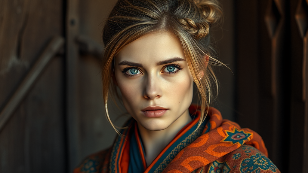 A captivating portrait of a stunning Siberian woman, exuding a thoughtful introspection. Her deep blue eyes and fair complexion are framed by a slightly disheveled bun accentuated with subtle blonde highlights. She is adorned in newly crafted garments that feature a rich tapestry of orange and blue batik patterns, enveloping her in a testament to her cultural roots. The aged, rustic background is bathed in a warm glow, casting a gentle halo around her, enhancing the depth of her contemplative gaze. The ambiance is both intimate and profound, capturing the spirit of her heritage and personal reflection.