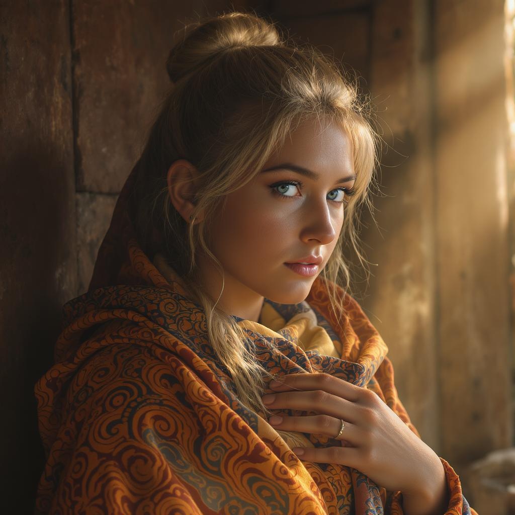 A captivating portrait of a stunning Siberian woman lost in introspection, her piercing blue eyes striking against her mild complexion. Her hair is styled in a messy bun with sun-kissed blonde highlights, adding a touch of effortless grace. She is adorned in intricately layered garments, the fabric alive with vibrant swirls of orange and blue, echoing the rich patterns of traditional batik. A shawl drapes elegantly around her, symbolizing her deep connection to her heritage. The scene is set with an old rustic backdrop, where warm light filters in, creating a soft halo that enhances the depth and poignancy of her expression, weaving a subtle story of resilience and reflection.