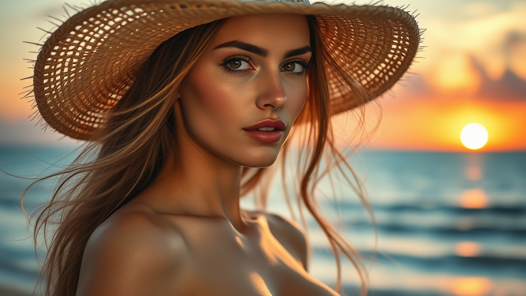 A captivating portrait of a stunning woman with long flowing hair, her bare shoulders glowing in the warm light. She dons an elegant straw sunhat, casting delicate shadows on her face. The scene is set against a mesmerizing ocean backdrop at sunset, where the sky is painted with hues of orange and pink. The sun-kissed ambiance is enhanced by subtle sunflare, creating an ethereal and serene atmosphere.