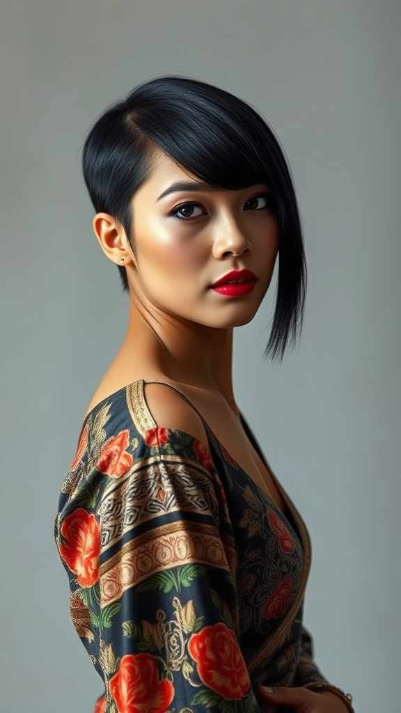 A captivating portrait of a stunning young woman with an undercut hairstyle, her figure is both slender and gracefully curved. She is adorned in a traditional Indonesian batik outfit, exuding a glamorous, elegant, and sophisticated aura. The scene is reminiscent of the iconic style of a renowned photographer, capturing her with striking clarity and an artistic eye. The setting establishes her as a figure of modern beauty, blending cultural richness with contemporary flair, her attire complementing her poised and confident demeanor.