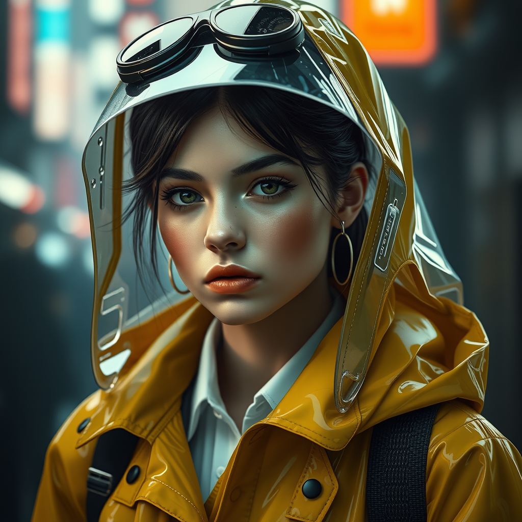 A captivating portrait of a stylish young European girl wearing a futuristic sci-fi raincoat, blending royal elegance and contemporary fashion. This visual masterpiece is inspired by the works of Ismail Inceoglu, Dragan Bibin, Hans Thoma, Greg Rutkowski, Alexandros Pyromallis, Nekro, and Rene Magritte. The girl's perfect face, sharp chin, and fine features are captured with intricate details, exuding a cyberpunk, Neo-Tokyo aesthetic reminiscent of a Bladerunner scene. The dramatic lighting enhances the richness of the colors, resulting in a hyper-realistic, lifelike texture. This professional, ultra-high-resolution image combines CGI and digital art to deliver a strikingly realistic portrait that embodies both realism and futuristic allure.