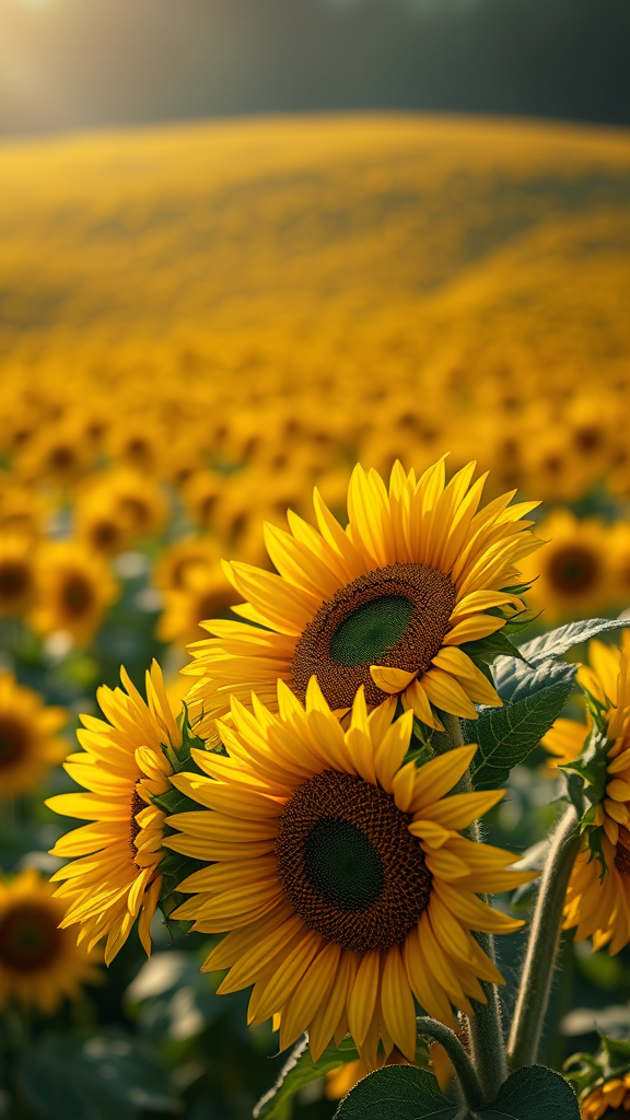 A captivating portrait of a sunflower bouquet, showcasing intricate details with a shallow depth of field that gently blurs a vast, sprawling field of sunflowers in the background. The scene is bathed in cinematic lighting, casting a warm glow that highlights the vibrant yellows and greens of the sunflowers, evoking a sense of serenity and grandeur. The hyper-realistic composition captures the essence of nature's beauty in stunning 8K resolution, transforming the moment into a true masterpiece.