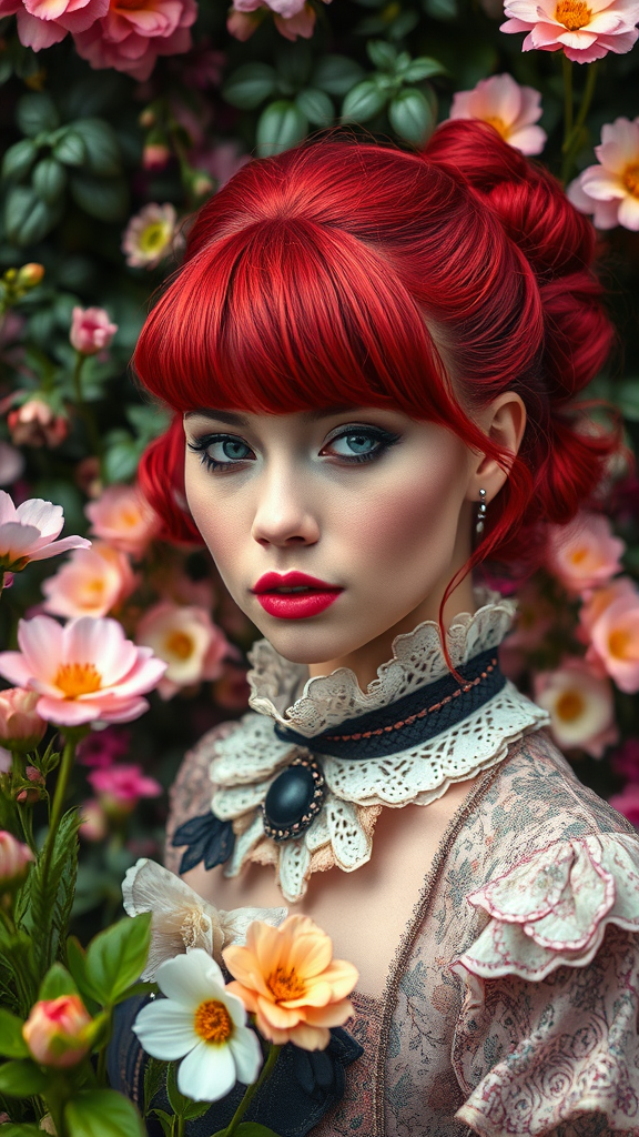 A captivating portrait of a Victorian 80s punk woman with vibrant red hair, surrounded by a gentle splash of pastel colors. She is set against a lush backdrop filled with a variety of plants and blooming flowers. The atmosphere combines a sense of rebellion and elegance, with intricate details reminiscent of Tom Bagshaw's style. Her attire blends Victorian elements with punk influences, creating a unique contrast highlighted by the colorful floral surroundings. The overall visual is striking, merging historical richness with a daring modern twist.