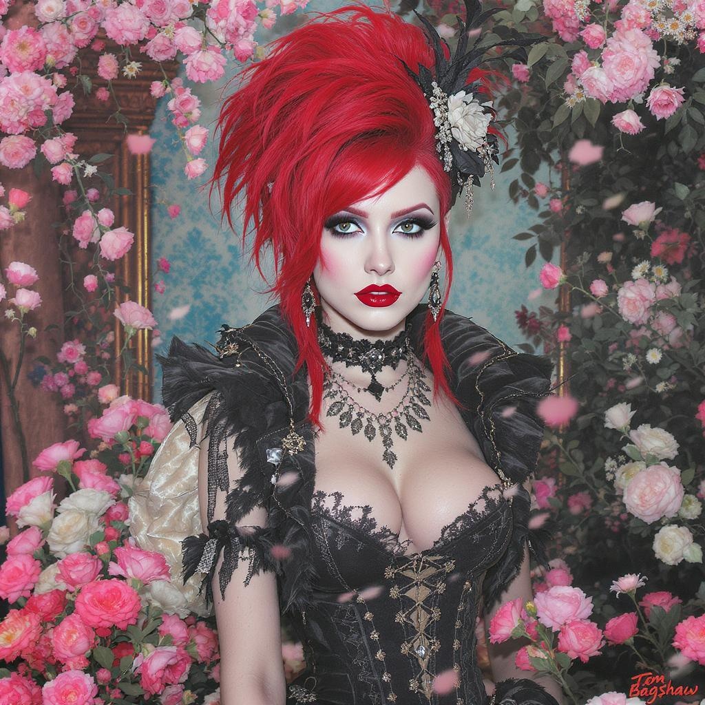 A captivating portrait of a Victorian-inspired 1980s punk woman featuring vibrant red hair, surrounded by a flurry of pastel colors. Her attire blends traditional Victorian style with edgy punk elements, adorned with intricate patterns. Lush greenery and blooming flowers gracefully frame her figure, adding a touch of natural elegance. The scene captures a harmonious collision of classic and rebellious aesthetics, infused with a subtle mystique reminiscent of Tom Bagshaw’s signature style.
