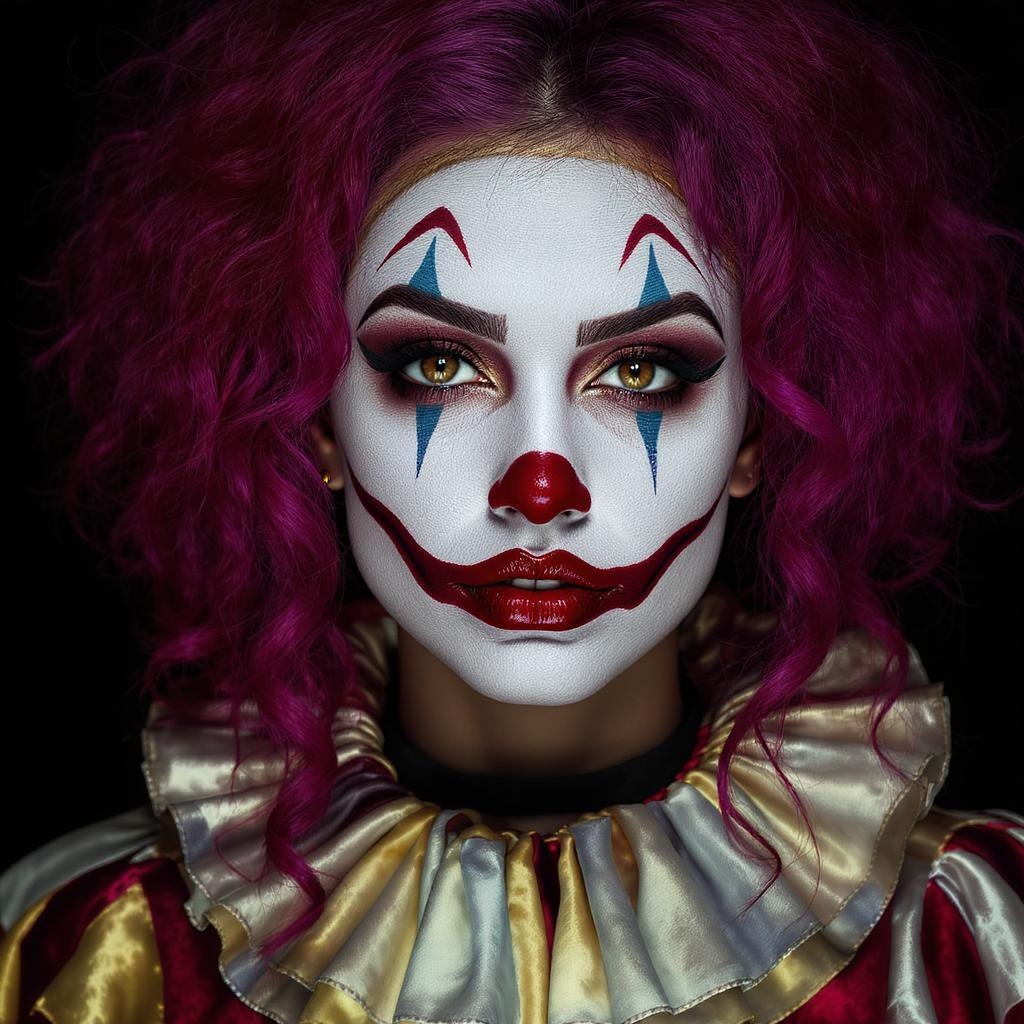 A captivating portrait of a woman adorned with intricate clown makeup, radiating breathtaking beauty and precision. The composition is centered, showcasing highly detailed linework and vibrant colors, reminiscent of a dynamic, cinematic masterpiece. Influences of Stefan Gesell's style are evident in the artwork's striking visual impact. Despite minor creative touches, the portrayal remains grounded in its core concept, maintaining exceptional quality at 8k resolution.