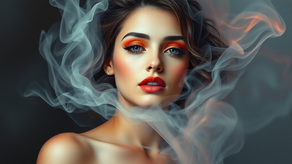 A captivating portrait of a woman enveloped in a swirling cloud of smoke, with hints of coral and pastel colors blending seamlessly into her ethereal form. Her coral makeup accentuates her sultry and seductive features, creating a mesmerizing contrast against the misty background. The oil painting style enhances the breathtaking allure of the composition, combining elements of hyper-realism with modern artistic aesthetics to produce a visually stunning and unforgettable image.