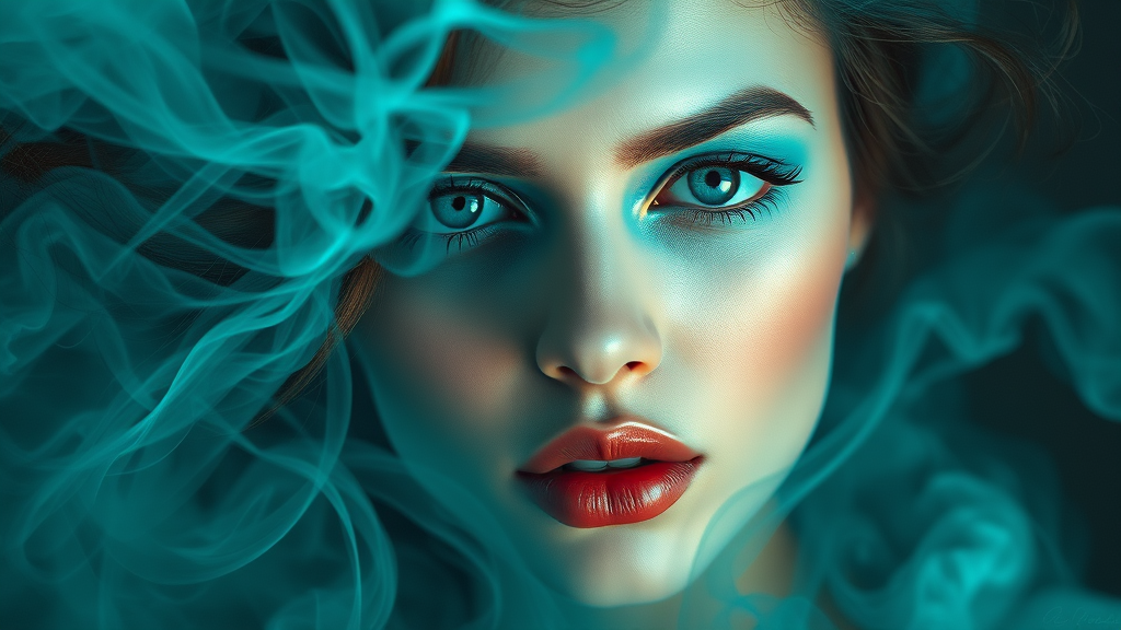 A captivating portrait of a woman enveloped in a swirling mist, ethereal cyan accents illuminating her features, subtle pastel hues blending seamlessly with her sultry cyan makeup. Her expression is both alluring and mesmerizing, capturing the essence of modern art's aesthetic allure. Painted in an oil style that blurs the line between hyper-realism and artistic abstraction, this breathtaking image reveals a misty, seductive atmosphere, with gentle tendrils of smoke adding an air of mystery.