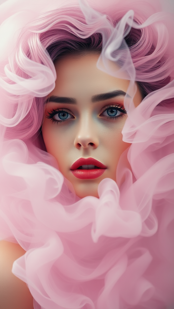 A captivating portrait of a woman enveloped in a swirling cloud of smoke, infused with whirlwind energy, featuring alluring pink highlights and makeup. Accents of delicate pastel tones, evoking misty, seductive, and sultry vibes, unfold in an oil painting style. The artwork embodies aesthetic modern art, with hyper-realistic details and breathtaking allure.