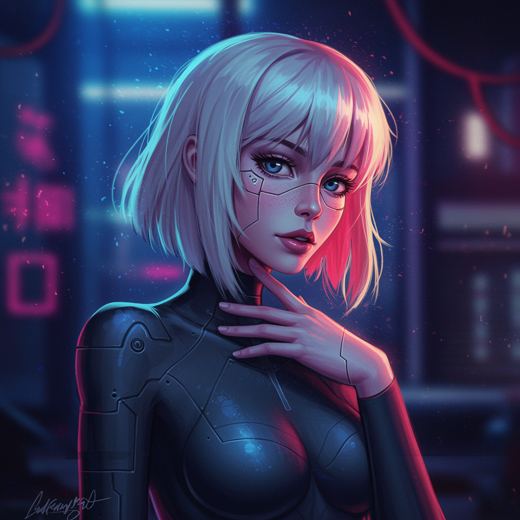 A captivating portrait of a woman in a futuristic, cyberpunk setting, inspired by a blend of anime and the iconic styles of Studio Ghibli and Akihiko Yoshida. The scene is illuminated with ethereal synthwave hues, highlighting her finely detailed features with soft, elegant light. The artistry captures a perfect fusion of sci-fi elegance and meticulous detail. Despite the framing, some abstract elements present, like the occasional text or signature, and a subtle nostalgic nod to low-resolution aesthetics with hints of jpeg artifacts. The anatomy may seem whimsical, with fingers, limbs, and features playfully reimagined, adding an avant-garde quality to the work. Although the quality may seem deliberately retro, with blurred lines and occasional misshaped forms, the image maintains a compelling allure.