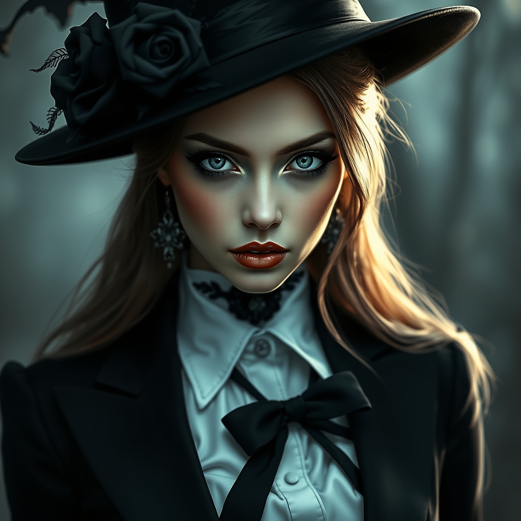 A captivating portrait of a woman in a striking black and white ensemble, embodying the essence of a fashionable gothic enchantress. Her eyes reflect a mystical depth, reminiscent of ethereal witches found in folklore, with an aura that exudes dark elegance. Inspired by the artistry of WLOP, Guweiz, and Loish, the artwork portrays a bewitching figure whose sophisticated attire complements her enigmatic presence. The scene is rich in atmospheric detail, blending gothic horror undertones with refined digital artistry, capturing the essence of a modern-day dark sorceress. Her expression is both haunting and mesmerizing, drawing the viewer into her shadowy realm.