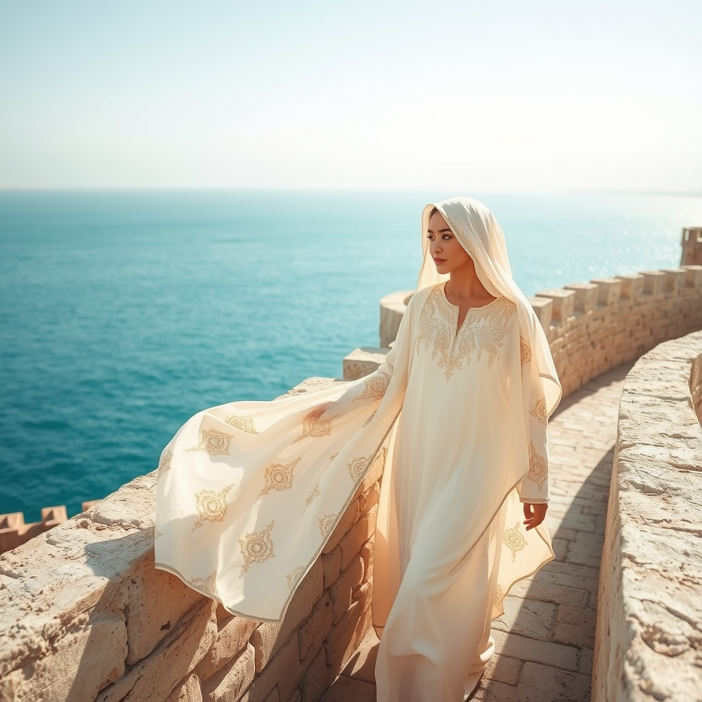 A captivating portrait of a woman in a traditional Bahraini Thobe, set against the backdrop of the historic Bahrain Fort. The Thobe, a flowing, ivory gown adorned with intricate patterns of gold and silver embroidery, catches the light as she gracefully moves along the ancient stone walls. Behind her, the endless expanse of the Arabian Gulf shimmers under the sun, its azure waves echoing the fort's storied past. The scene is a harmonious blend of history and nature, underscoring her timeless grace and the rich cultural tapestry of Bahrain.