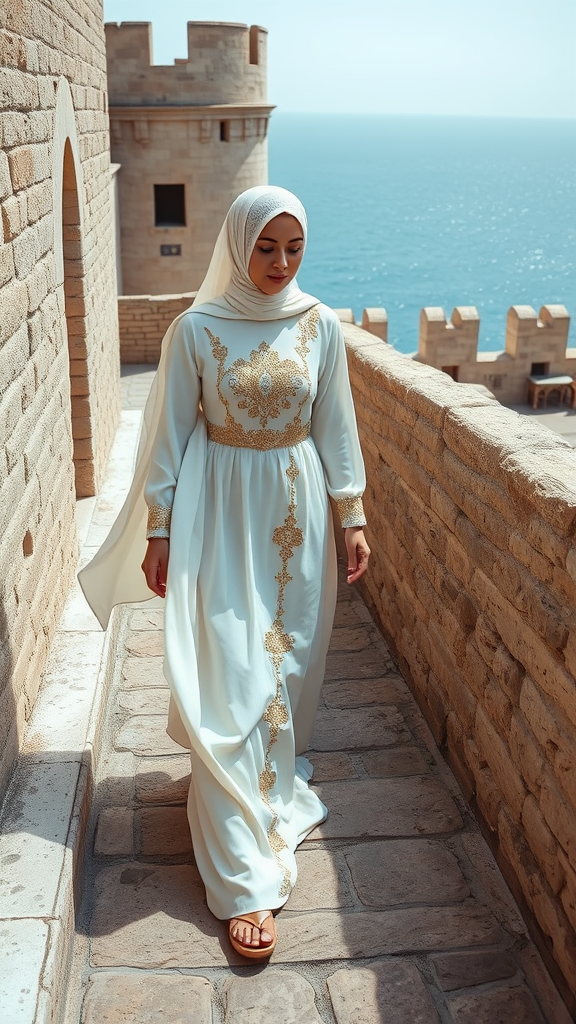 A captivating portrait of a woman in a traditional Bahraini Thobe, set against the timeless backdrop of Bahrain Fort. The Thobe is a flowing, ivory gown, intricately adorned with shimmering gold and silver embroidery. She gracefully strolls along the weathered stones of the fort's ancient battlements, with the sparkling waters of the Arabian Gulf stretching into the horizon behind her. The fusion of historic architecture and the serene natural landscape underscores her enduring elegance and Bahrain's vibrant history.