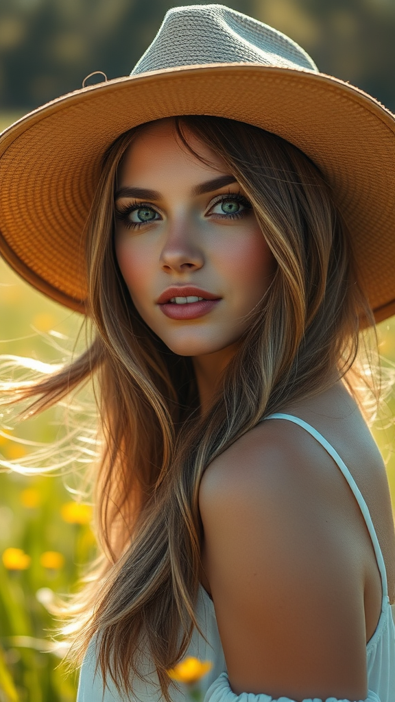 A captivating portrait of a woman standing in a sunlit meadow, her hair catching the golden rays as it gently sways in the breeze, her eyes reflecting a sense of wonder and adventure beneath a wide-brimmed hat.