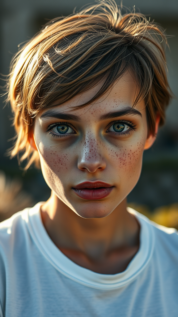 A captivating portrait of a woman with a sprinkle of freckles, expressive round eyes, and short tousled hair, set outdoors against a backdrop of soft natural light. Her chapped lips and white t-shirt add to the raw authenticity of the image as she gazes intently at the camera. The scene boasts magical realism and a striking play of dramatic lighting that highlights the ultra-detailed textures of her skin. The intimate portrait composition, reminiscent of a Leica 50mm, f1.4 shot, captures the essence of her character in a timeless and evocative manner.