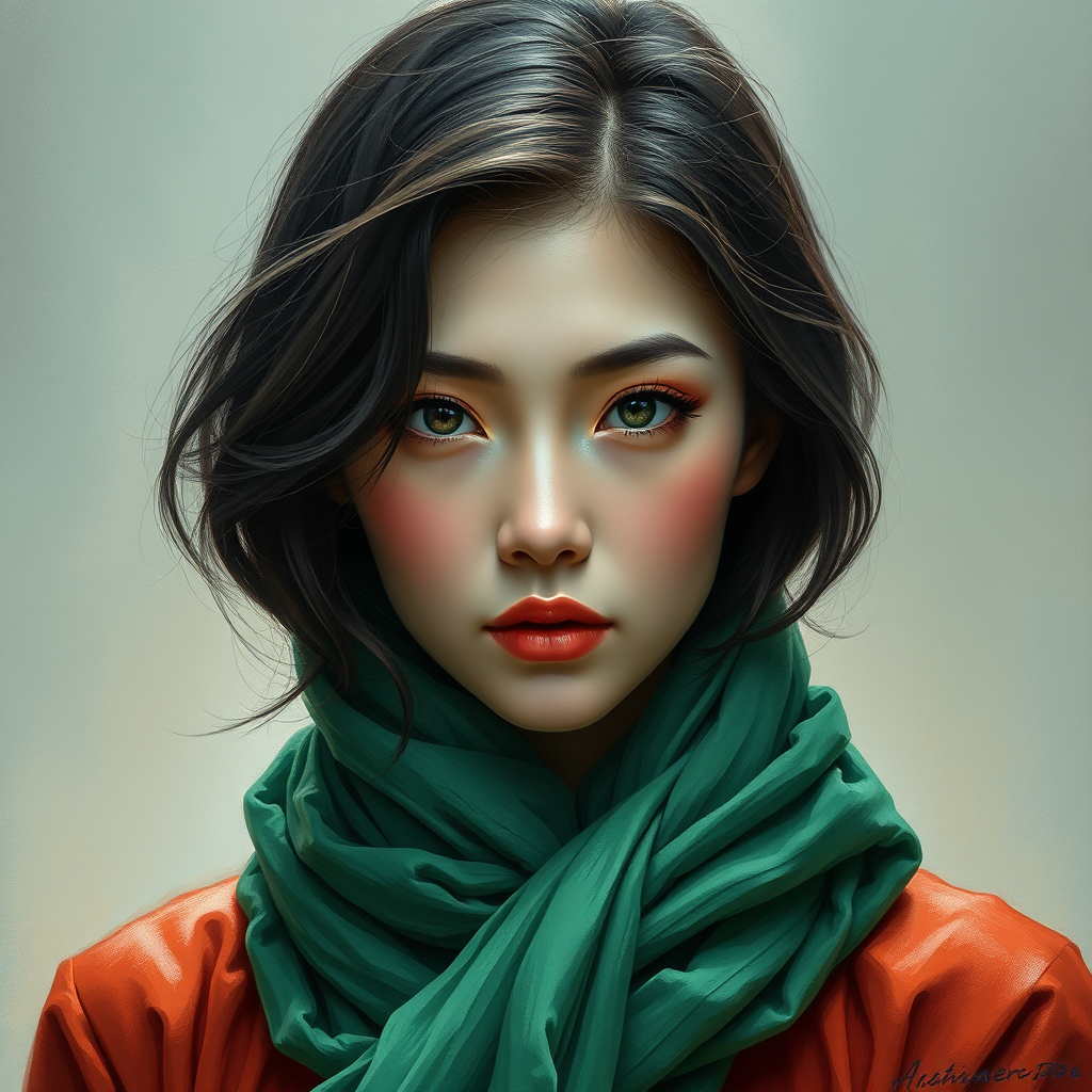 A captivating portrait of a woman with a vibrant green scarf elegantly wrapped around her neck, her eyes reflecting a serene yet enigmatic expression. Inspired by the style of Sim Sa-jeong and the photorealistic approach of Ilya Kuvshinov, this artwork blends traditional and contemporary influences, showcasing intricate details and lifelike textures. Her hair cascades softly over her shoulders against a subtle, harmonious background that complements the richness of her attire. Each brushstroke on this high-definition Artstation masterpiece captures the essence of her mysterious allure, creating a seamless balance between realism and artistic expression.