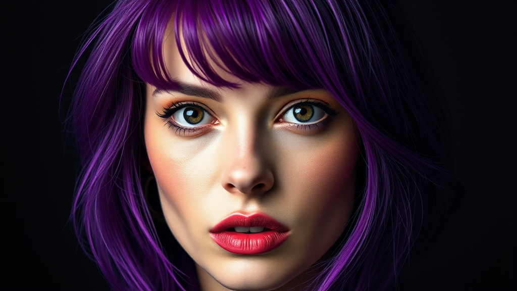 A captivating portrait of a woman with electric purple hair, featuring the playful spirit of Andy Warhol and the stark elegance of Richard Avedon. The image blends pop art's vivid hues and clean lines with the high-contrast clarity of minimalist photography. Her face is intricately detailed, her eyes holding a compelling gaze, set against a bold, contrasting background. This composition encapsulates the essence of iconic and contemporary pop culture.