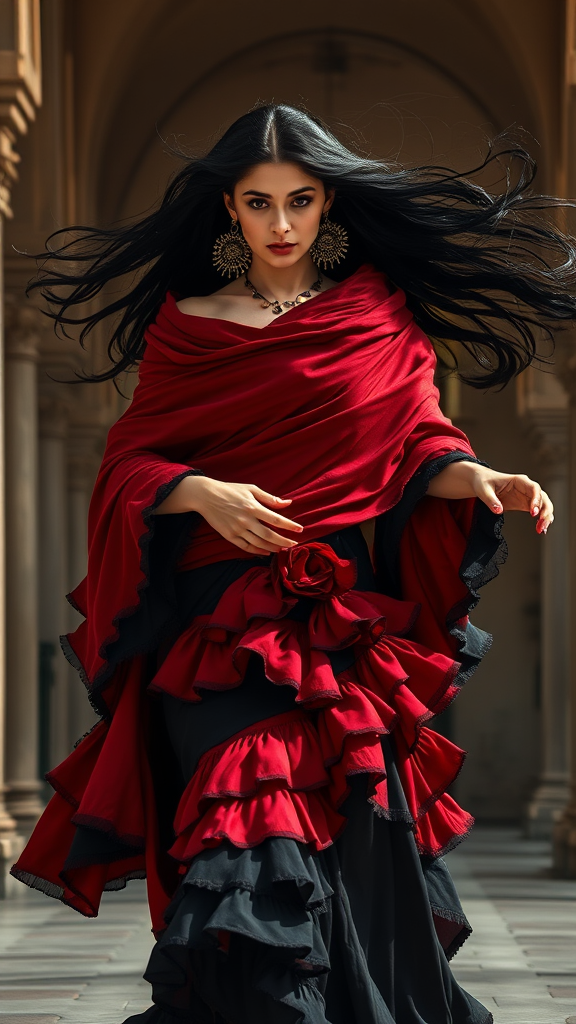 A captivating portrait of a woman with four intricate giant earrings and flowing black hair. She is adorned in a very long dress with a huge shawl, featuring a striking bata de cola with elaborate frills and flounces in a bold red-black palette. The scene is set against the backdrop of Mudéjar-style architecture, merging seamlessly with Romanesque elements. Captured in a dynamic dancing pose, the image exudes passion, grace, and emotional depth, with a composition that is both epic and imbued with a tribal dark fantasy essence. The play of dramatic shadows enhances the overall atmosphere, echoing the style of Fabian Perez.