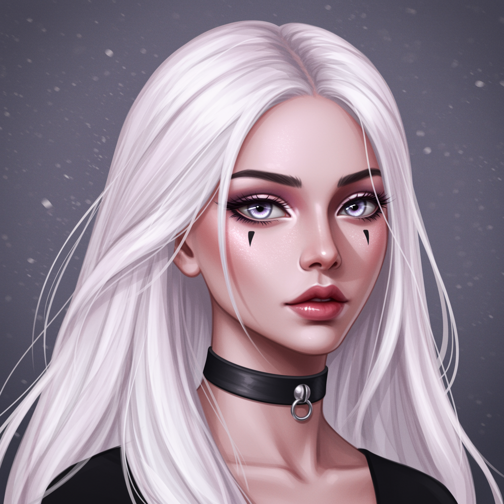 A captivating portrait of a woman with shimmering platinum-white hair cascading down her back, adorned with a sleek black choker. The artwork captures the stylized essence of guweiz, seamlessly blending the photorealistic finesse and soft ethereal touch characteristic of wlop and loish. Her facial features are delicately rendered with a blend of anime realism that highlights her luminescent, porcelain skin and piercing eyes. The intricate details of her expression and the subtle play of light and shadow across her face evoke a sense of depth and emotion, creating an enchanting visual harmony.