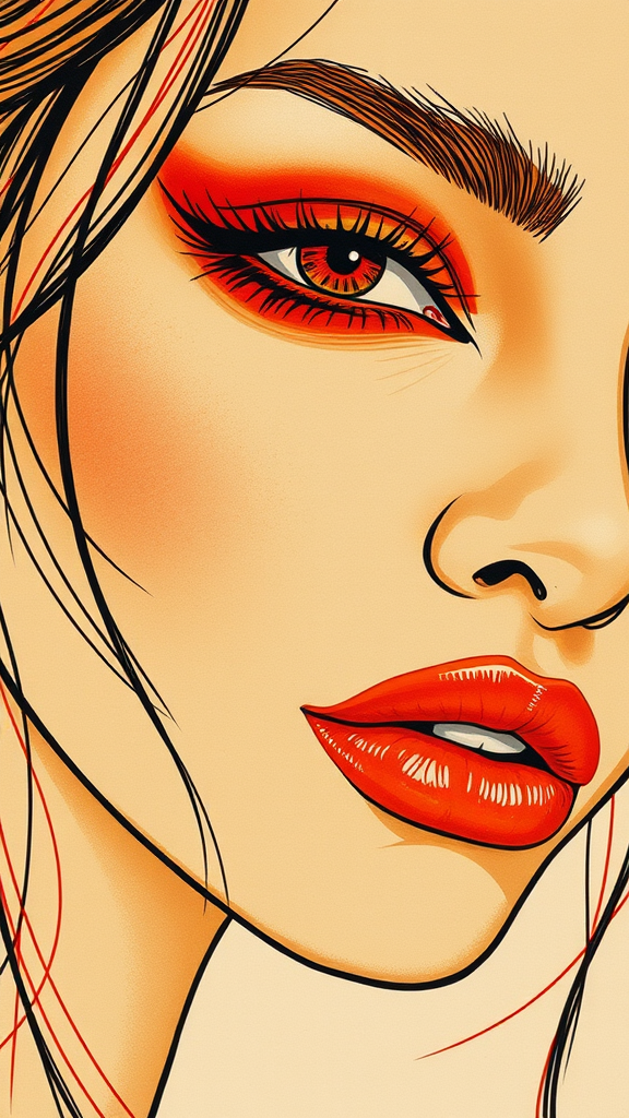 A captivating portrait of a woman's face featuring striking red eyeshadow, crafted with bold and colorful lines in rich tones of dark beige and orange. The piece showcases exceptional line work, using wire-like elements to create an edgy and raw aesthetic. The overall composition maintains the allure of flawless line work, blending vivid colors while exuding a sense of intensity and emotion.