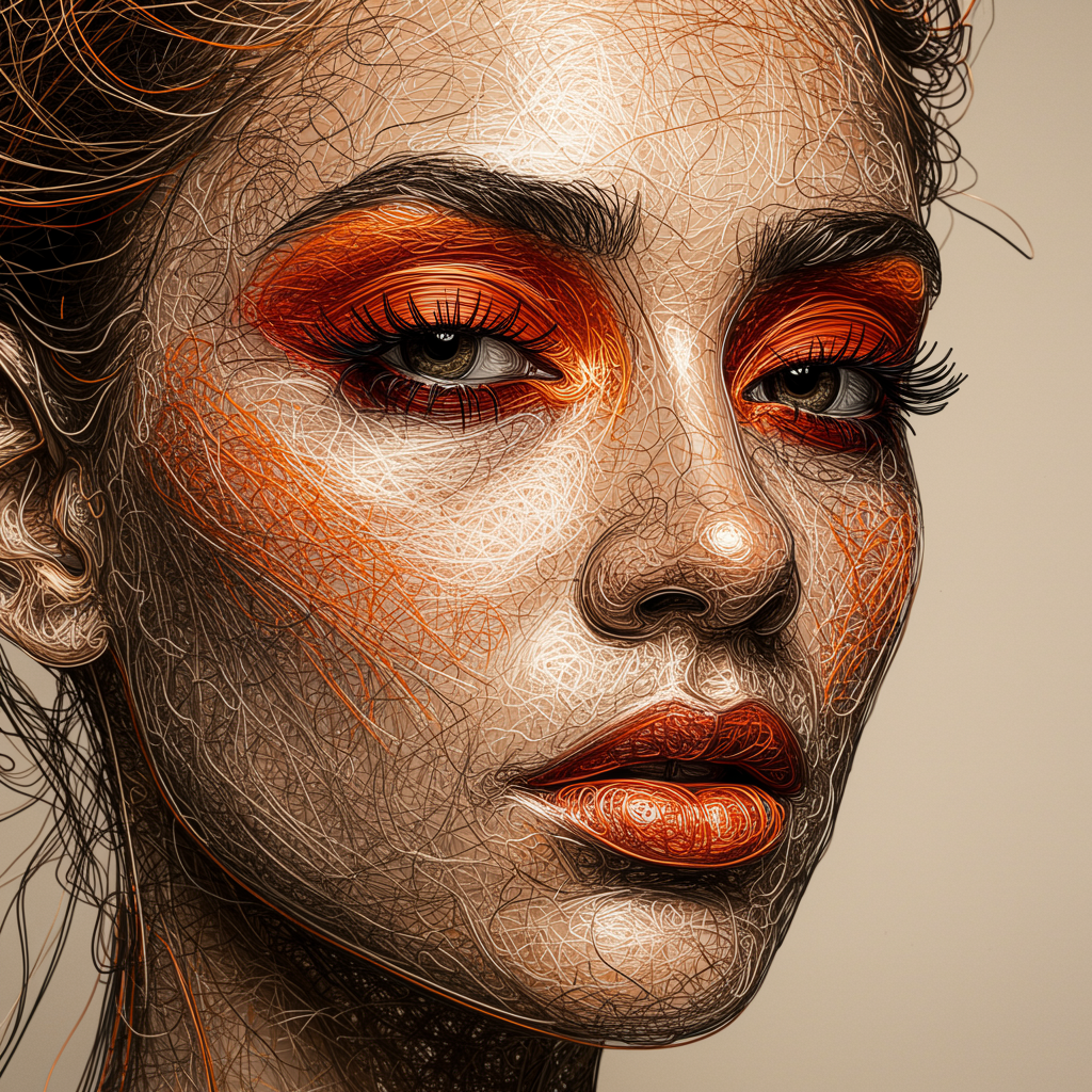 A captivating portrait of a woman’s face featuring striking red eyeshadow, created with bold, colorful lines in shades of dark beige and orange. The artwork is composed of intricate wire-like structures, showcasing impeccable line work with a raw and edgy aesthetic. The dynamic use of color and form adds an expressive depth to the portrait, maintaining its compelling allure while introducing subtle creative enhancements.