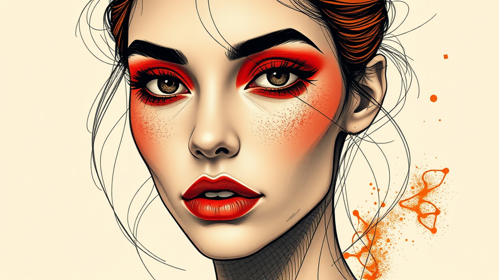 A captivating portrait of a woman's face rendered with bold, colorful lines, featuring striking red eyeshadow. The artwork employs dark beige and orange hues, constructed in a wire-like style with flawless line work. The expression captures a raw and edgy essence, with small creative elements woven into the design to enhance the overall depth and intrigue, subtly diverging from the traditional yet maintaining the core concept. The composition is harmonious yet striking, blending abstract dynamism with a focus on meticulous detail.