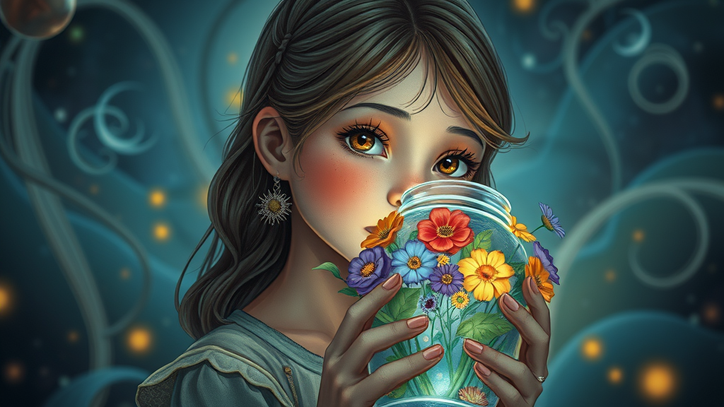A captivating portrait of a young girl holding a jar filled with vibrant, dreamlike flowers, set against a nocturnal backdrop. The scene is illustrated in a detailed storybook style, with glowing colors and multidimensional shading that bring the mysterious night to life. The girl's face shows a hint of dirt, adding a touch of realism to the fantastical setting. Her ears are adorned with intricate earrings, and her expression is both curious and serene. The background features soft, swirling patterns that suggest a world of imagination and wonder, illuminated by an ethereal light that casts gentle shadows.