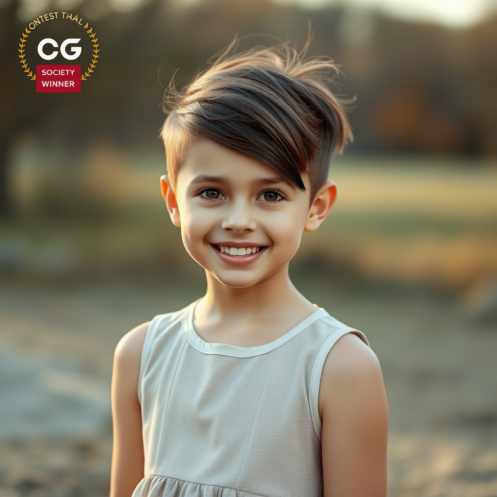 A captivating portrait of a young, radiant girl with a joyful smile, showcasing an asymmetrical haircut. She is wearing an elegant fall dress in an outdoor setting, expertly captured by a skilled photographer. The image exudes a minimalist aesthetic, emphasizing the serene outdoor backdrop. This stunning piece has gained recognition as a contest winner and has been highlighted on platforms like CG Society.