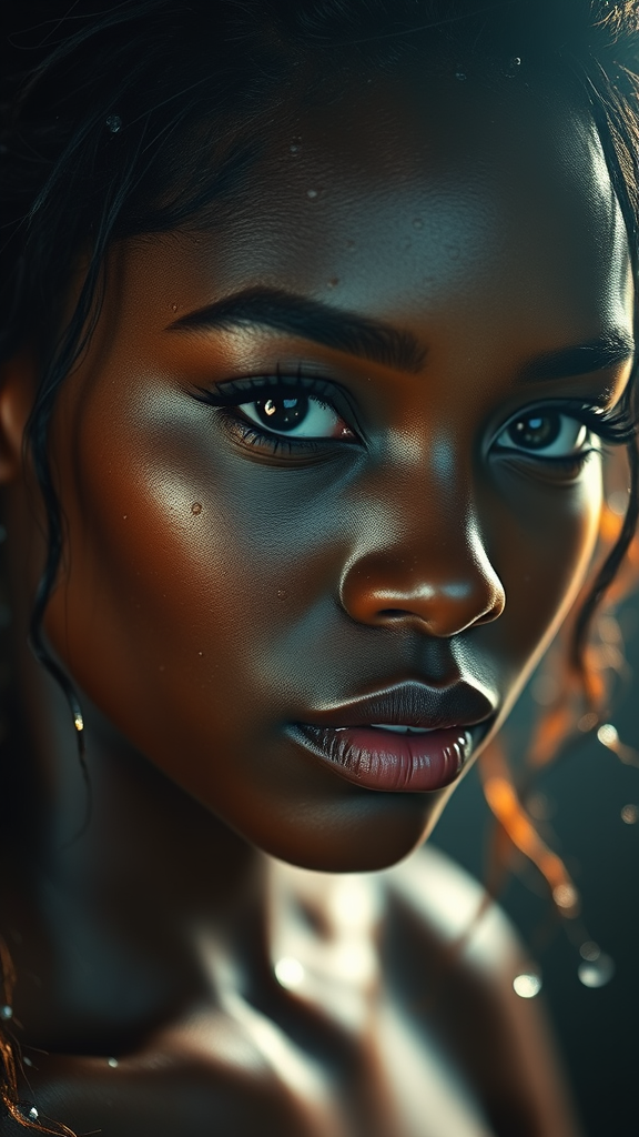A captivating portrait of a young stunning black woman with glistening water droplets adorning her skin and hair, exuding an enigmatic gaze. The image boasts high-resolution, lifelike quality, reminiscent of professional fashion photography, with a cinematic perspective. Dynamic lighting illuminates her from behind, casting a soft, ethereal glow.