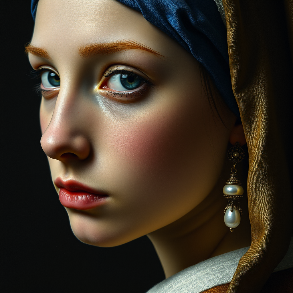A captivating portrait of a young woman adorned with a lustrous pearl earring, rendered in the exquisite style of the Dutch Golden Age. The composition presents an intimate close-up, showcasing fine details in stunning 32k UHD resolution. Reimagined with influences from the late 19th century Venetian school, the painting reflects an interplay of light and shadow, reminiscent of Francesco Solimena's deft touch. The woman's enigmatic gaze is captured against a softly blurred, darkened background, enhancing the richness of her traditional attire, with subtle modern twists in fabric texture and color palette, maintaining the timeless elegance of the original masterpiece.