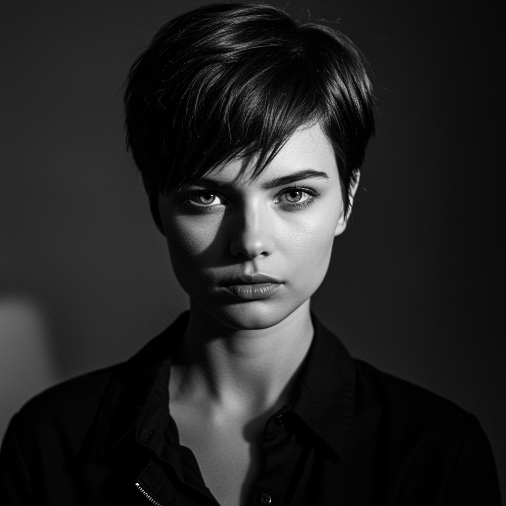 A captivating portrait of a young woman boasting a chic haircut and intense eyes. Captured in a high-contrast aesthetic, the image is characterized by pronounced shadows and bright highlights that accentuate the model's defined features. The photograph, taken with a vintage film camera using a swift prime lens, conveys a gritty and authentic atmosphere. This portrait is ideal for fashion editorials, marketing visuals, or as an eye-catching piece of art for display.
