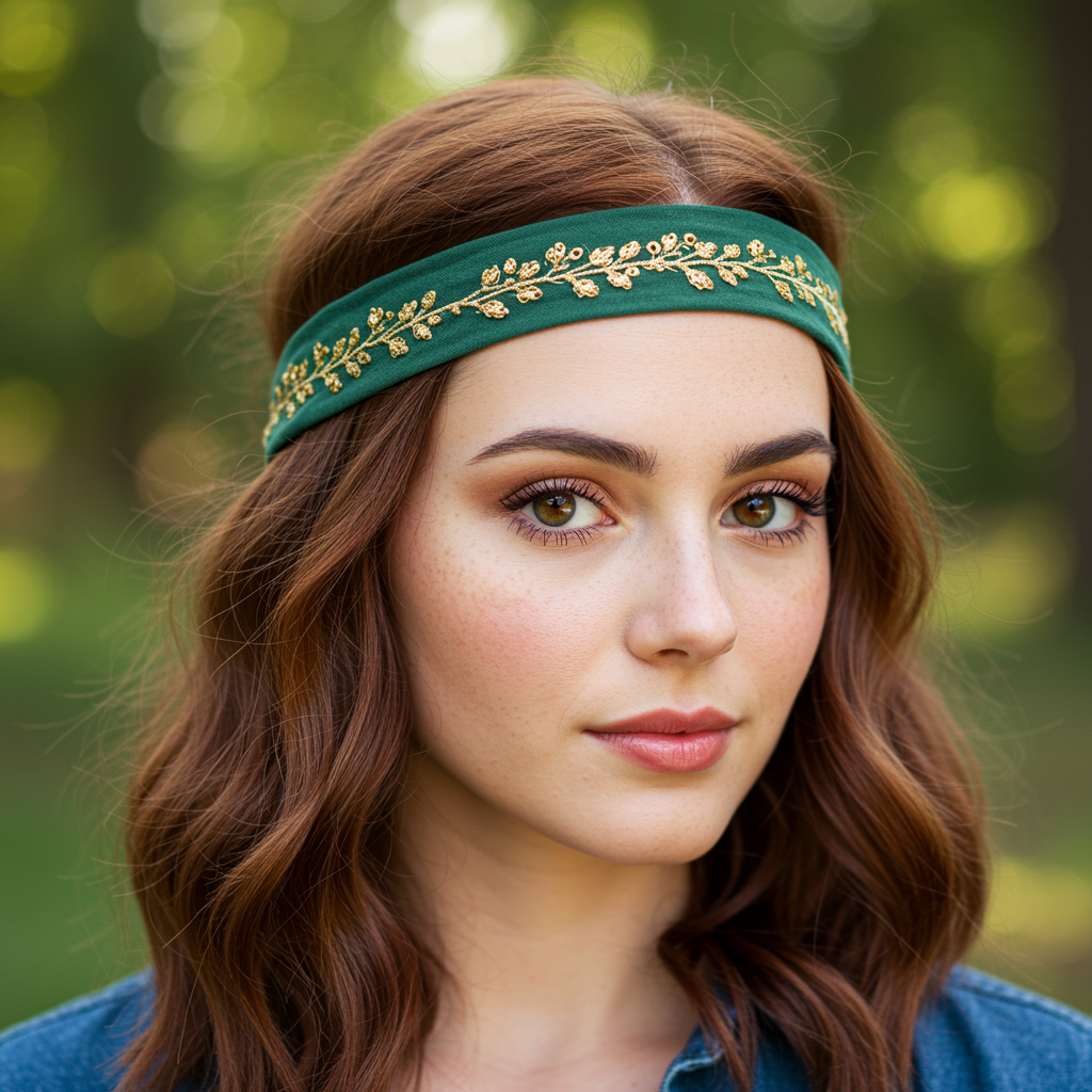 A captivating portrait of a young woman exuding tranquility, her delicate features highlighted by her serene expression. Her soft auburn hair falls in gentle waves, adorned with a green headband featuring intricate golden leaf patterns. Her skin is luminous and clear, accentuating her warm hazel eyes that radiate quiet assurance. She is dressed in a casually elegant attire, featuring a relaxed chambray garment. The natural, gentle lighting casts a warm glow, enhancing the inviting and comforting atmosphere of the portrait.