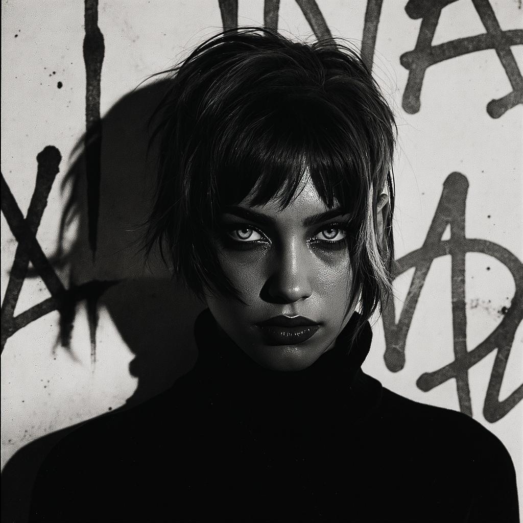 A captivating portrait of a young woman featuring a chic haircut and intense, captivating eyes. The shot is characterized by a high-contrast approach, accentuating the model's angular features with pronounced shadows and highlights. Captured with a film camera using a fast prime lens, the image exudes a textured and authentic vibe. This compelling portrait is ideal for fashion editorials, marketing campaigns, or as a bold piece of wall art. Subtle creative enhancements include layering soft textures in the background that mimic the look of urban graffiti, adding a contemporary edge to the overall composition.