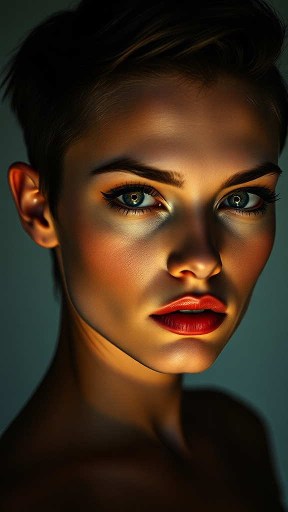 A captivating portrait of a young woman with a chic, asymmetrical haircut and intense, captivating eyes. The image is captured in a high-contrast style, with dramatic shadows and bright highlights that accentuate her angular features. Taken with a vintage film camera equipped with a fast prime lens, the photo possesses a textured and raw aesthetic. This portrait is ideal for fashion editorials, marketing campaigns, or as a bold statement piece in art collections.