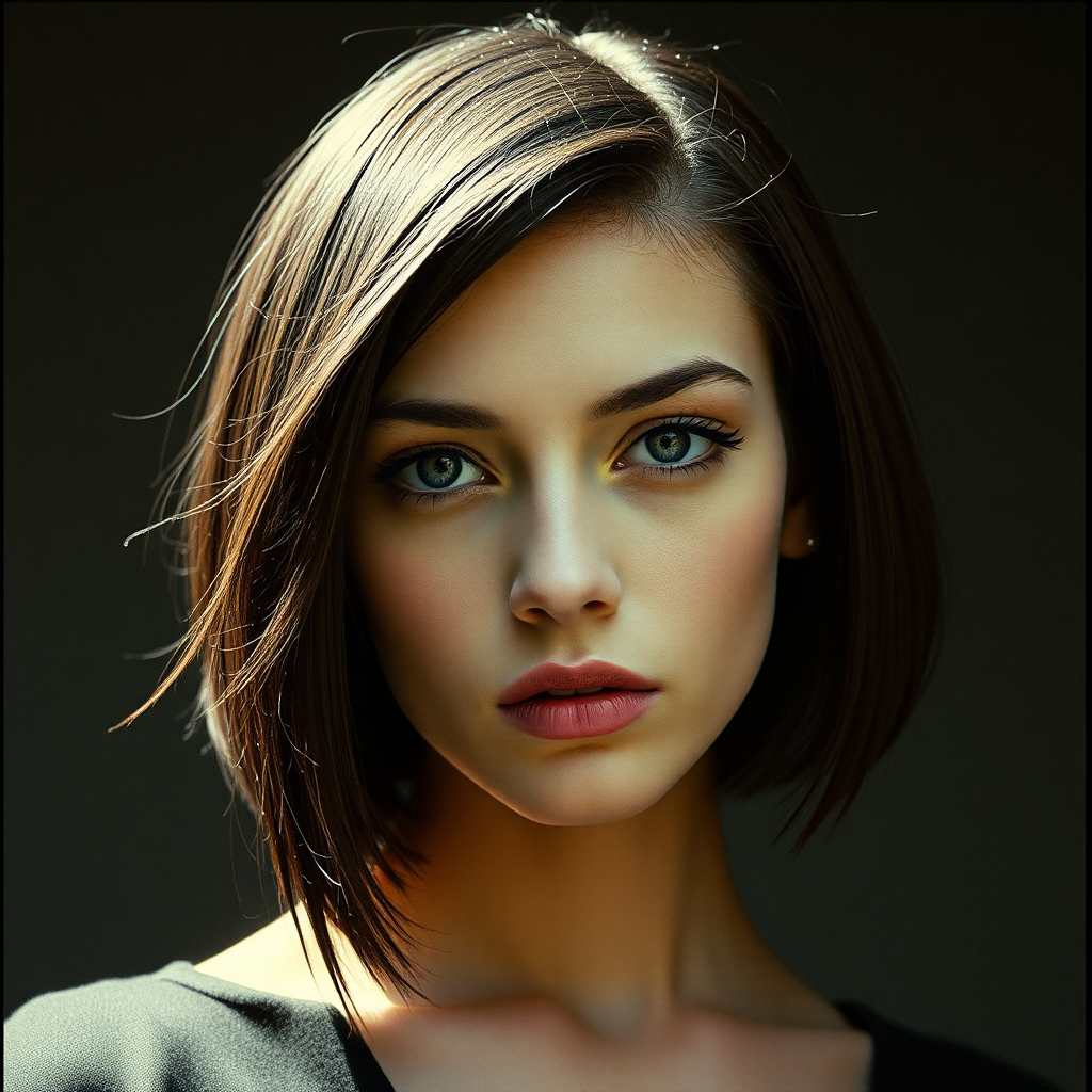 A captivating portrait of a young woman with a chic, asymmetrical bob and intense, captivating eyes. Shot in a high-contrast style, the image plays with deep shadows and bright highlights that accentuate the model's angular features and distinct cheekbones. Captured using a vintage film camera with a fast prime lens, the photograph exudes a textured, raw aesthetic. Ideal for fashion editorials, dynamic ad campaigns, or as an eye-catching wall art piece, the portrait combines elegance and edginess effortlessly.