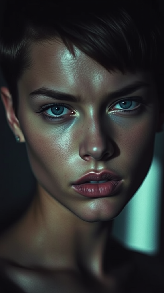 A captivating portrait of a young woman with a modern pixie cut, her intense eyes drawing the viewer in. Shot in a high-contrast noir style, the image features dramatic shadows and bright highlights, accentuating the model's defined cheekbones and strong jawline. Captured with a vintage film camera and a fast 50mm prime lens, the photo exudes a textured and authentic vibe. This striking image would be ideal for high-end fashion publications, cutting-edge advertising campaigns, or as a bold centerpiece in contemporary art collections.