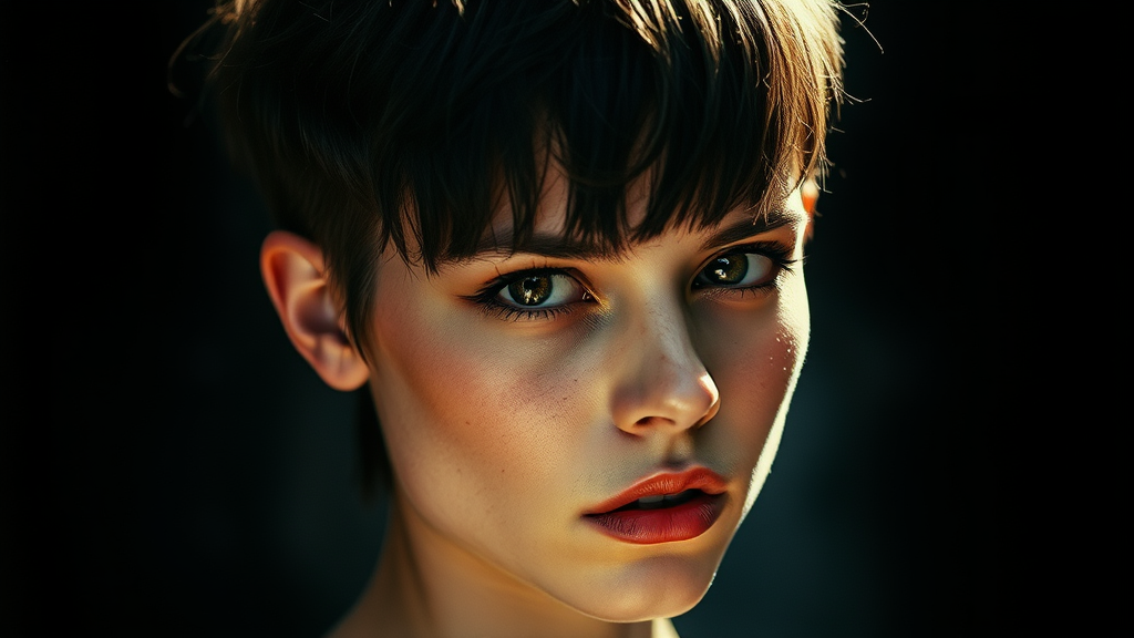 A captivating portrait of a young woman with an edgy haircut and penetrating gaze. The image is captured in a bold, high-contrast style, with pronounced shadows and bright highlights accentuating her defined features. Shot with a vintage film camera and a fast prime lens, the photo exudes a gritty, authentic vibe. This portrait is ideal for fashion editorials, advertising campaigns, or as an eye-catching piece of wall art.
