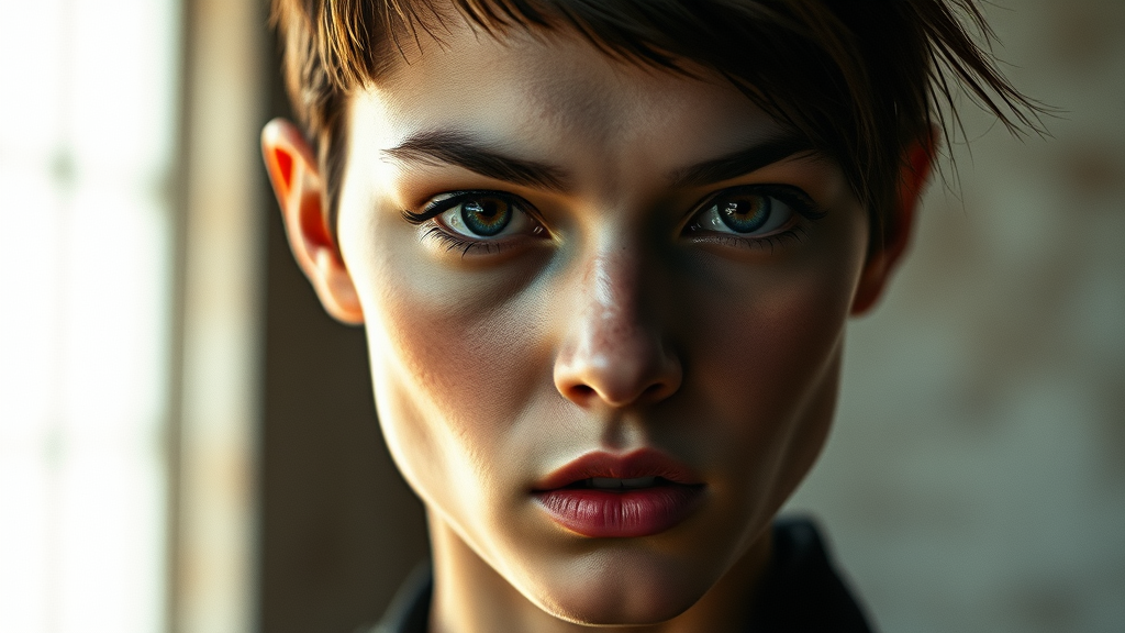 A captivating portrait of a young woman with an edgy haircut and intense gaze. The image is captured in a high-contrast style, with dramatic shadows and bright highlights accentuating her defined features. Shot with a film camera using a fast prime lens, the photograph exudes a textured and unrefined quality. This striking image is ideal for fashion editorials, advertising campaigns, or as a stunning wall art piece.