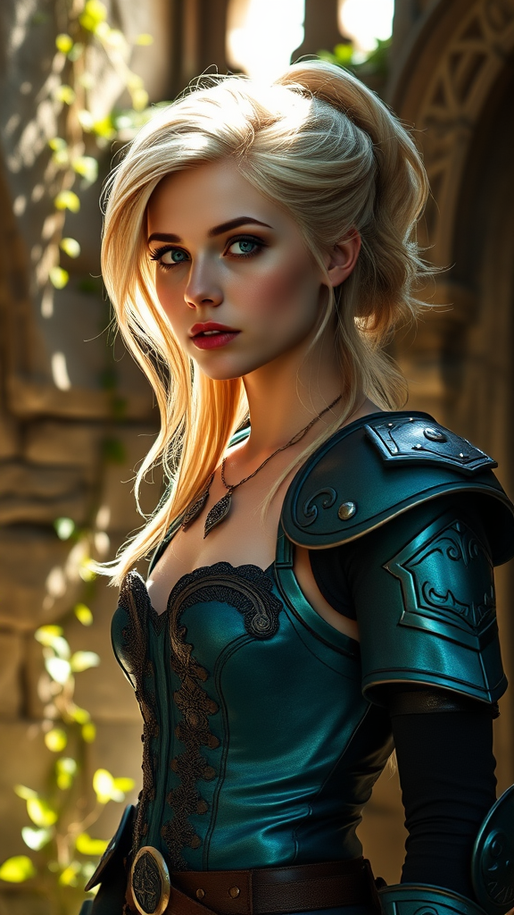 A captivating portrait of a young woman with elegantly styled blonde hair in an upsweep, embodying the essence of a medieval RPG character. She stands solo, exuding the adventurous aura of a swashbuckler rogue. Her outfit features a form-fitting corset shirt under ornate teal armor, the metallic sheen subtly catching the bright morning light streaming in from the side. The indoor setting is intriguingly overgrown, with tendrils of greenery creeping along the stone walls, adding a touch of untamed beauty to the scene. Her eyes are sharp and attentive, suggesting a daring spirit ready for her next clandestine mission.