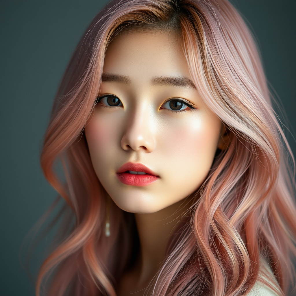 A captivating portrait of a young woman with soft rose-pink hair, featuring a dreamy film grain texture. Captured in high definition, the image exudes a polished, studio-quality aesthetic. The subject is of Asian descent, with striking Chinese features, and the portrait showcases her serene expression and captivating presence, all rendered through the sophisticated lens of a Nikon D850.
