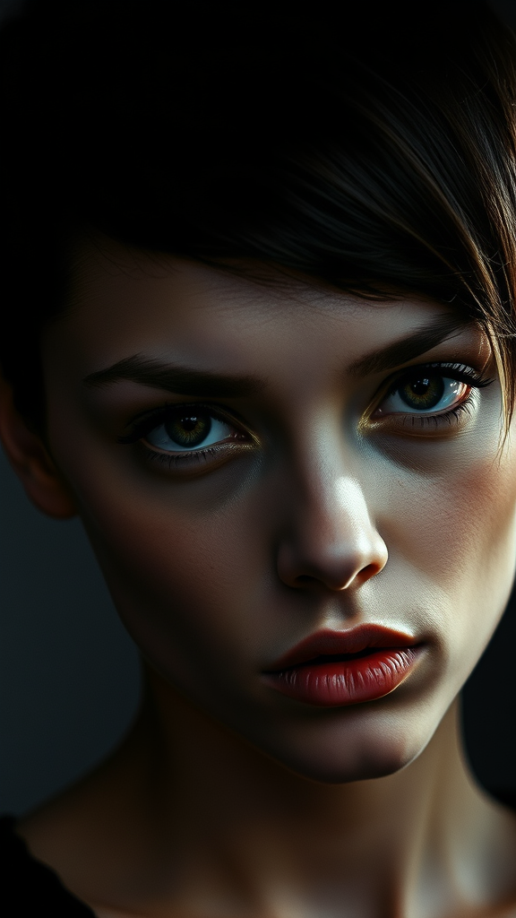 A captivating portrait of a young woman with striking features and intense eyes framed by a modern haircut. The image is captured in a high-contrast style, playing with deep shadows and bright highlights that accentuate the model's angular facial structure. Shot on a vintage film camera using a fast prime lens, the photograph exudes a textured and unpolished aesthetic. This compelling portrait is well-suited for fashion editorials, advertising projects, or as an eye-catching wall art piece.