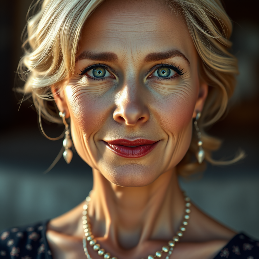 A captivating portrait of an elegant middle-aged woman, gazing confidently at the viewer, with a full-body pose. Captured with a Leica 50mm lens, the image boasts top-tier quality and high resolution, featuring exquisite lighting reminiscent of Hasselblad photography. Her skin shows natural texture, with beautiful blonde hair framing her face. The artwork incorporates a blend of hyper-realistic rendering and painterly anime-inspired illustration. The character presents a flawless yet expressive face, with subtly exaggerated features like large eyes and an enchanting smile, accentuated by delicate jewelry. The overall composition retains a sense of harmony, avoiding the pitfalls of unrealistic anatomy or disjointed elements, to convey a truly refined and artistic depiction.