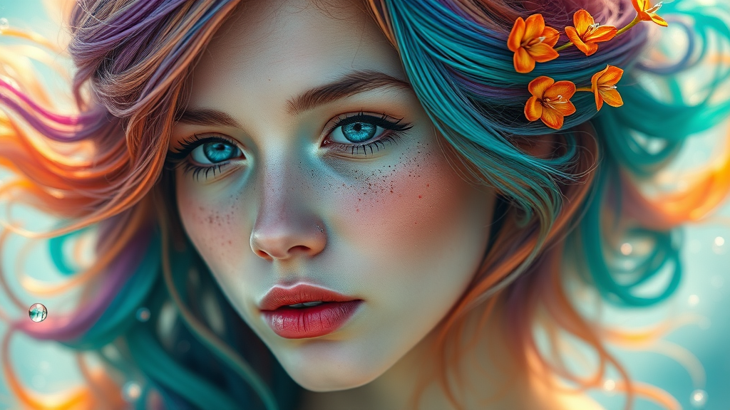 View this AI-generated image featuring a captivating portrait of an enchanting and colorful woman with an ethereal aura reminiscent of a mythical mermaid or siren her skin is fair punctuated by youthful features and wide expressive eyes delicate freckles scatter across her nose and cheeks adding a t
