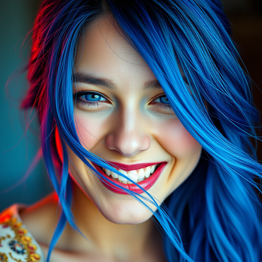 A captivating portrait of an enchanting woman with vibrant blue hair, her radiant smile captured in dynamic animated gif style, emphasizing spontaneous, fleeting moments with intricate, blink-and-you-miss-it detail. Photographed with the vivid tones of provia, influenced by the artistry of Inessa Garmash and Natalia Rak, with a vividly colorized effect, expressed in a raw, natural aesthetic, in an aspect ratio of 51:109.