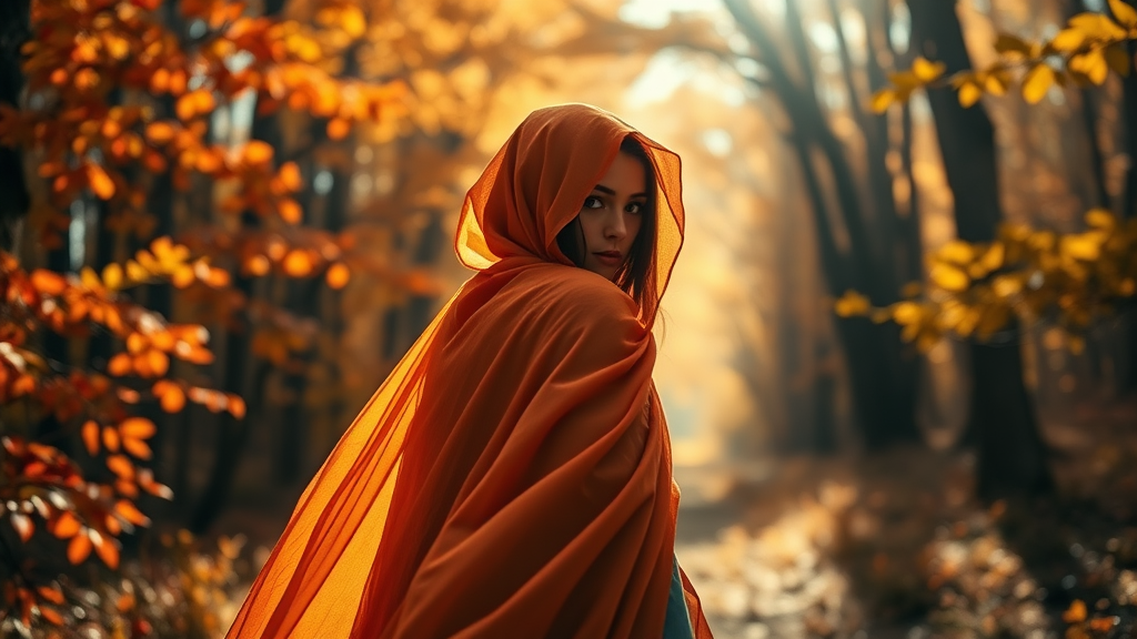 A captivating portrait of an enigmatic woman draped in a flowing orange veil cloak, strolling through a vibrant autumn forest. The image features sharp detail and a dramatic focus, captured in high-resolution to highlight the rich textures and colors. Bathed in dynamic backlighting, the scene is accentuated by a cinematic angle that draws attention to the mysterious allure of the subject. The bokeh effect adds a touch of magic to the sunlit leaves, enhancing the realistic and professional photography style.