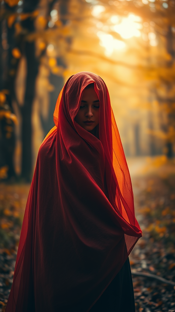 A captivating portrait of an enigmatic woman draped in a rust-colored veil strolls through a vibrant autumn woodland, captured with exquisite detail and intense focus. The high-resolution, lifelike image showcases professional photographic techniques, featuring a cinematic perspective and dynamic backlighting that creates a mesmerizing glow. The background softly blurs with an artistic bokeh effect, enhancing the mystical aura of the setting, while the golden leaves around her rustle gently in the crisp air.